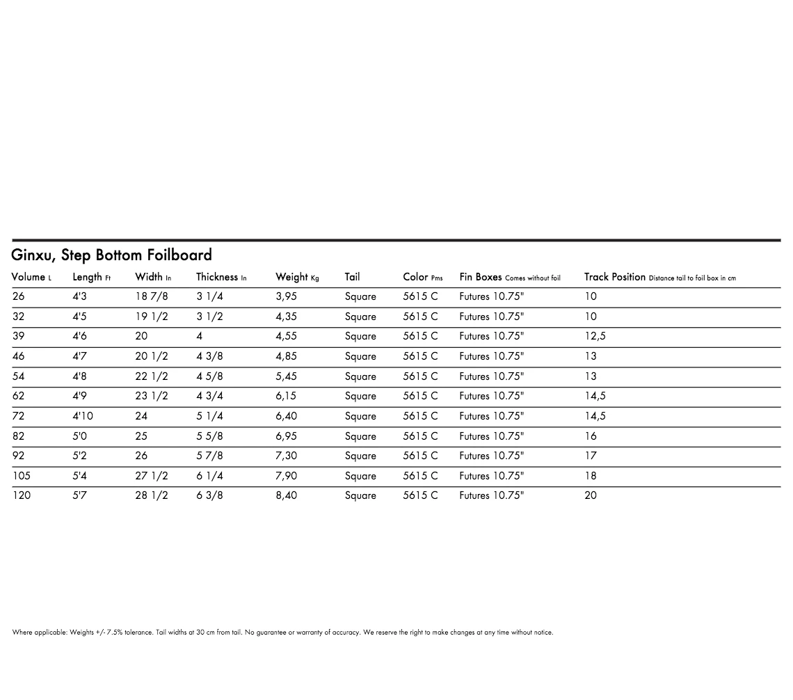 The Ginxuβs revolutionary design features the Step Bottom (patented), a cutout on the entire bottom rear 1/3 of the board, including the foil box. This creates an unprecedented connection to the foil, in fact the most direct connection of any foilboard to date. Itβs like Gravity Control. For touchdowns, it reduces catching and deceleration leading to getting stuck or falling, because when the bottom of the board now recontacts the water, the rear section and foil are still βairborne,β so you receive Automatic Lift and can easily take back off. Most surprisingly of all it makes it incredibly easy to initially take off, because the moment you get a little bit of speed on the water and the board starts to rise to the watersβ surface, even though the front 2/3rds of the bottom of the board is still in the water, the foil is already out of the water and flying, creating an Ultra Boost, getting you going much quicker than traditional designs.