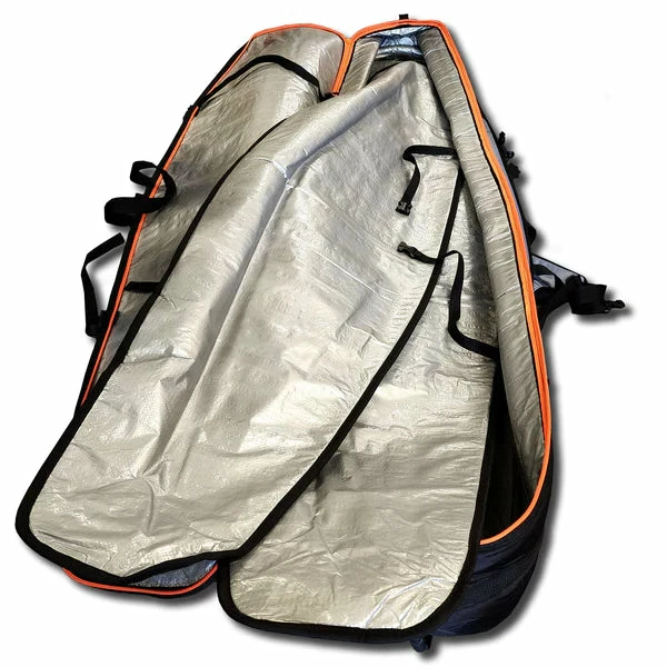 Construction: Our Surfboard Travel Coffin is constructed with a 3/8″ closed cell packing foam that is sandwiched between two layers of material. On the outside is a 600d Cordura that is able to withstand the harshest of conditions. On the inside is a heat resistant, UV coated heavyweight tarpoline, with 600d cordura nose and tail patches. 1000D Ballistic Cordura reinforces the nose and tail on both the top and bottom